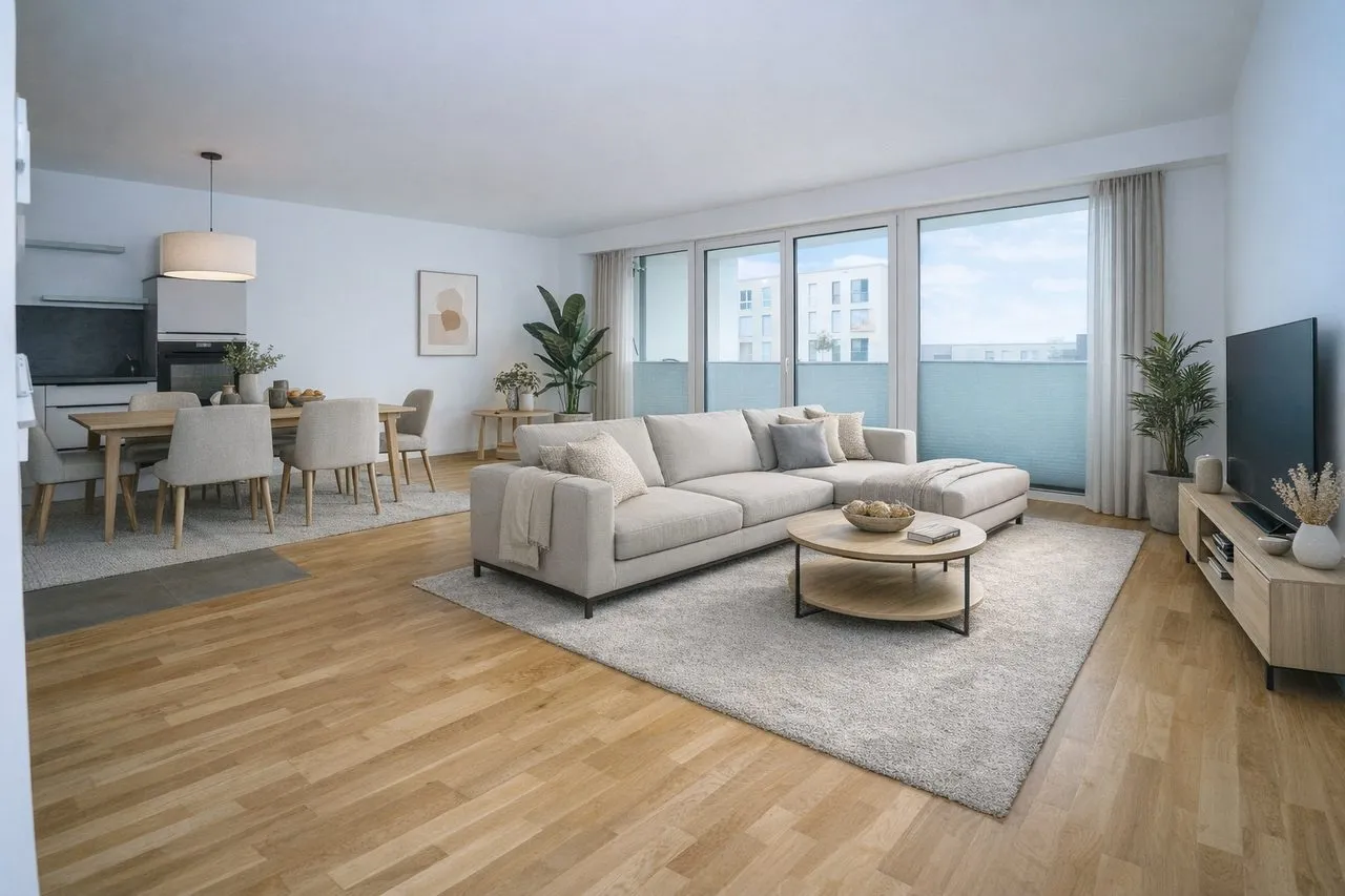 Auf einer Wohnfläche von ca. 80 m² bietet die Wohnung helle, großzügig geschnittene Räume mit hochwertigen Echtholz-Parkettböden und Fußbodenheizung in allen Zimmern. Der offene Wohn- und Essbereich schafft ein einladendes Ambiente und öffnet sich nahtlos zu einem privaten Balkon, der zum Verweilen im Freien einlädt.